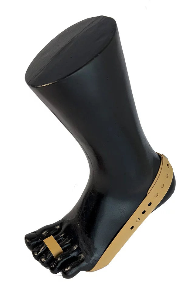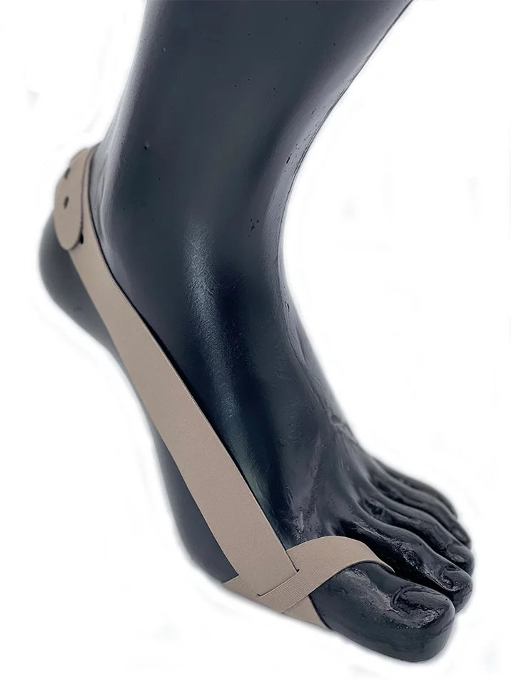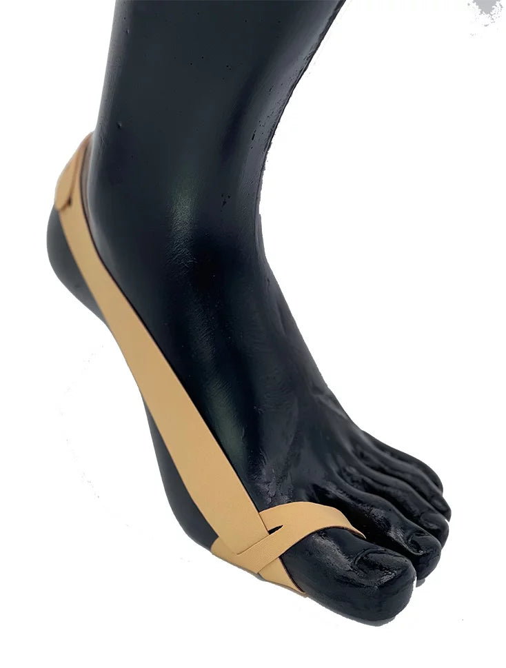 Lenkki asetetaan isovarpaan ympärille ja nauha vedetään alhaalta kantapään yli.